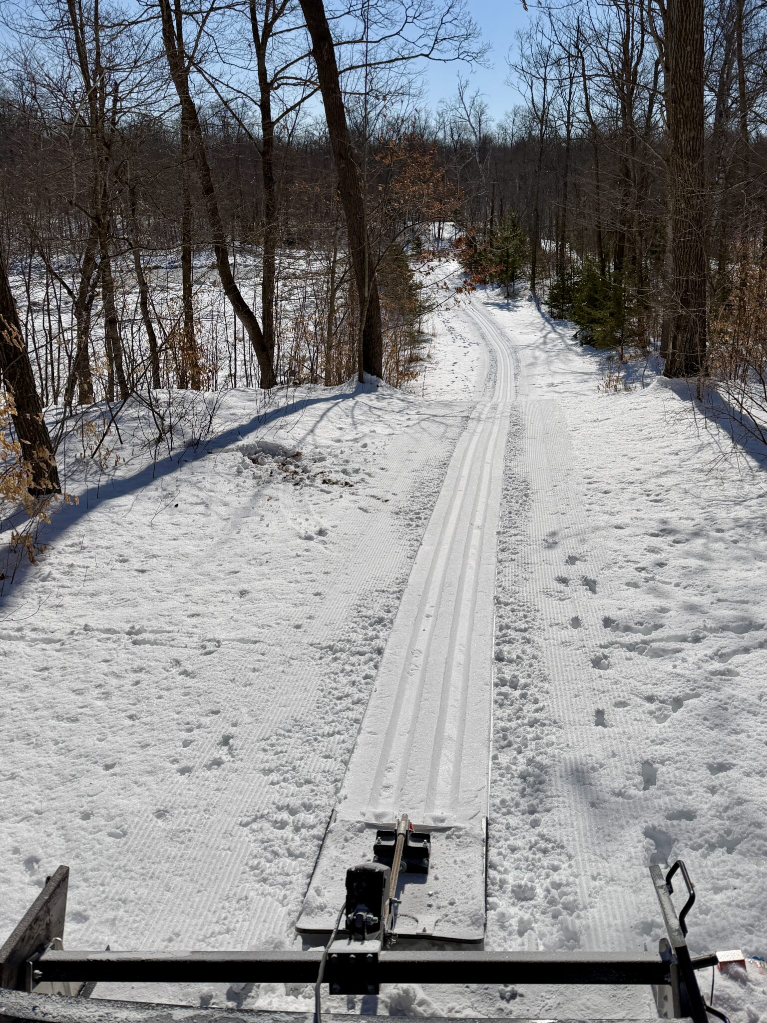 Trails are open! Beautiful sunny day, feels a bit more like January with mid teens for temps and a breeze from the north. Freezing down hard overnight which allowed us to groom this morning. Skate loop renovated and combed and tracks renovated and reset on Sap Run and Sukkerbusk. A bit chunky but still decent skiing. Also fresh track set on Twin Lakes and JibFly which groomed out really nice. With a melty day Sunday and a refreeze, tracks are a bit faster but grooming pulling up drier/sugary snow. Looks to be below freezing all day today which should make all day good skiing. Watch for sticky areas in the afternoon if sun stays out.