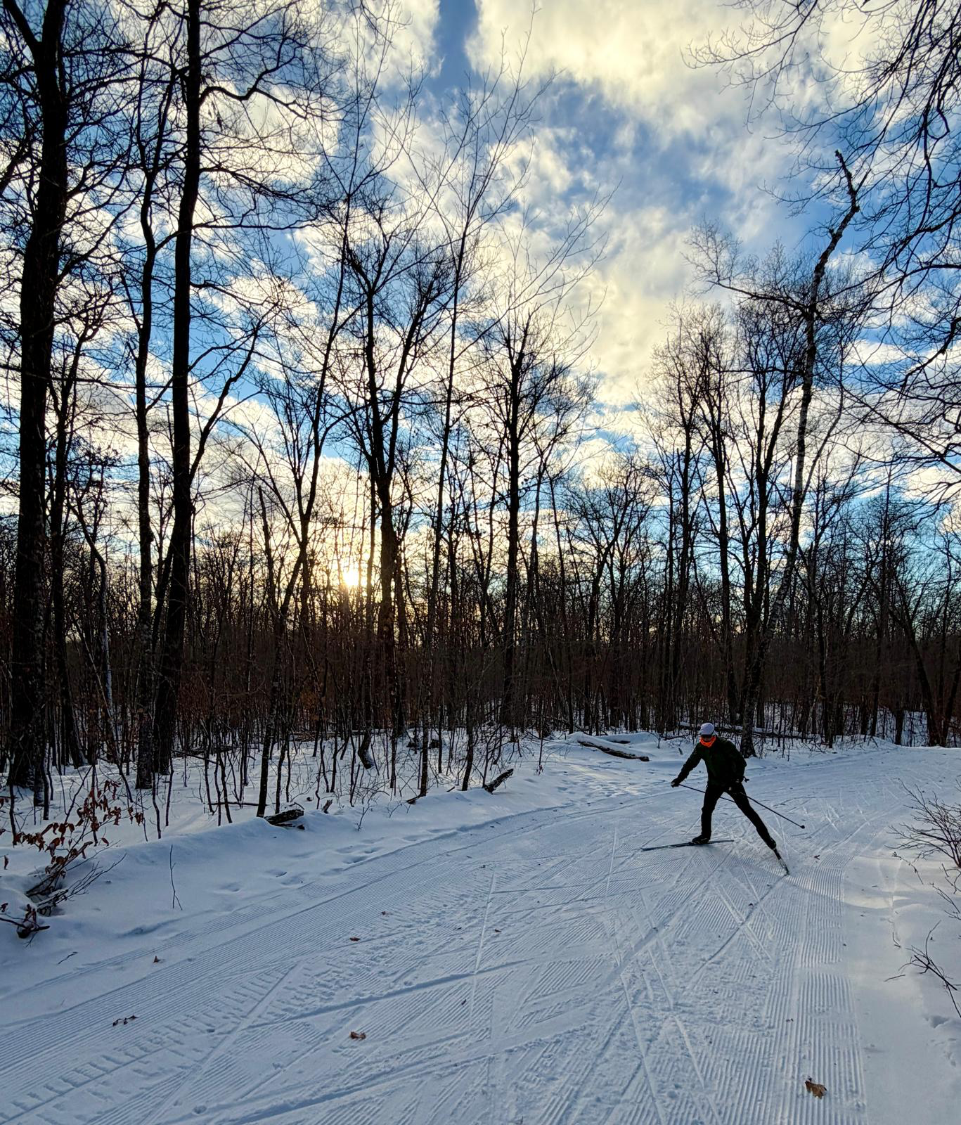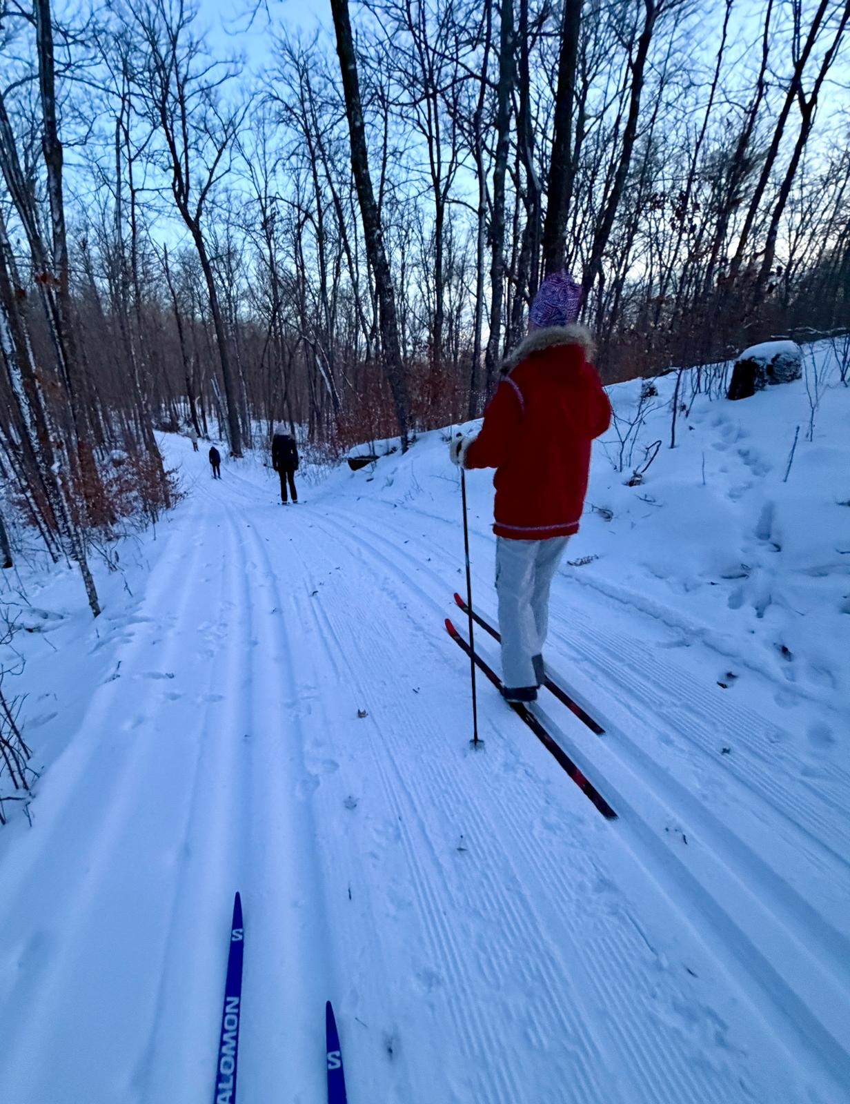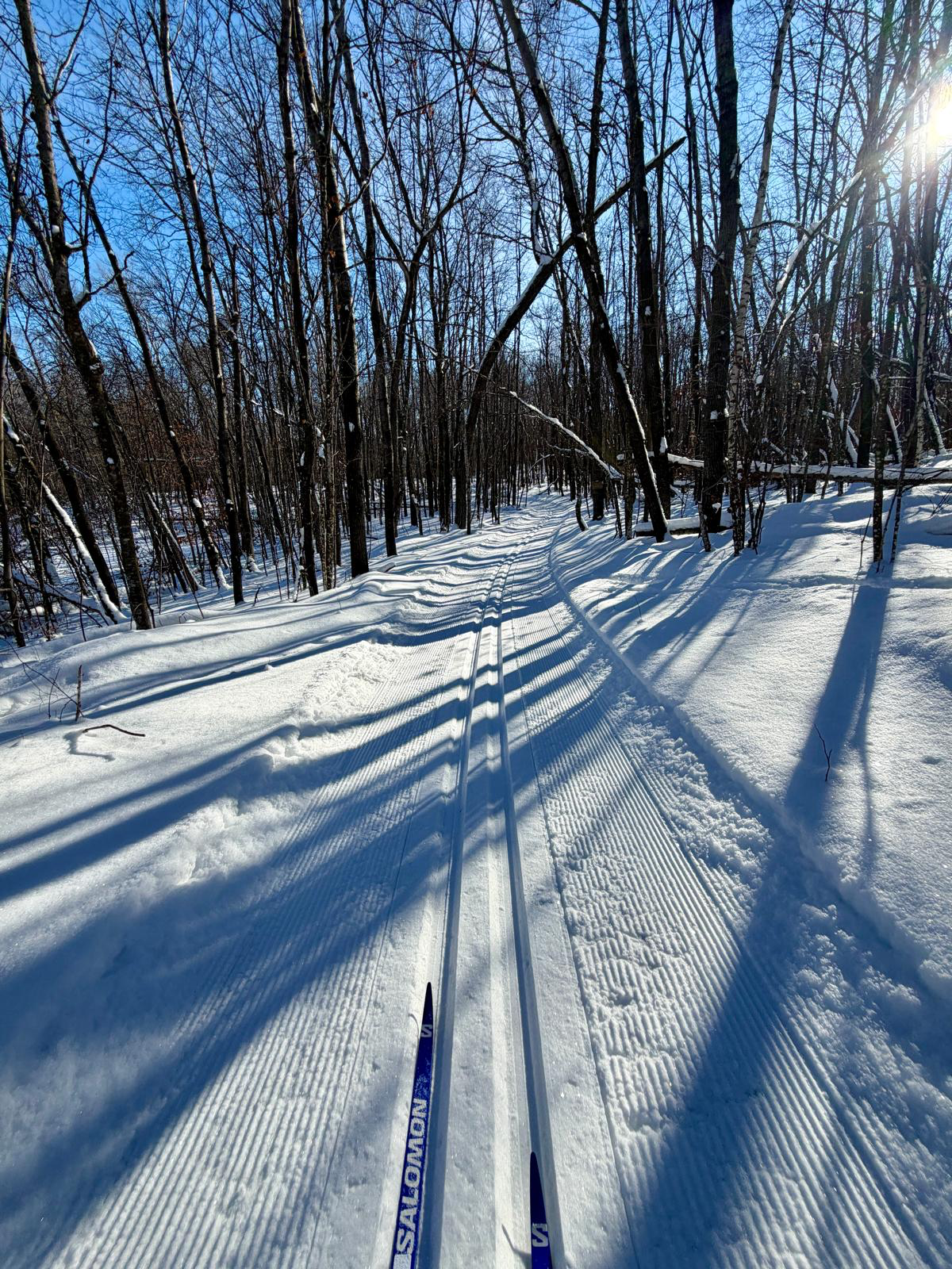 Skating on Skaters Waltz, the extension loops, North Loup, Single Green, Kristin’s Kutoff and Eira Bikwadinaa Hill. All other trails are tracked for classic skiing. (Please no skating on classic trails) Sukkerbusk is a great starter trail for classic which feeds the outer trails and crosses most of the inner trails providing a good “lay of the land”.