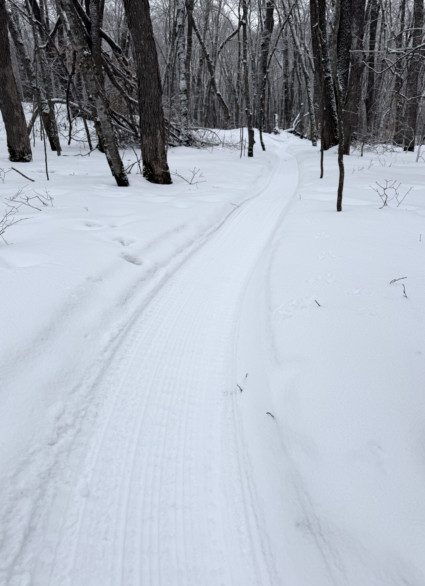 Trails are open After a fun run of spring skiing, winter has returned with cooler temps and 2-3″ of new snow. All double track classic trails groomed Thursday and all skate trails groomed again after being groomed Wednesday afternoon/early evening. Bullhead Bootleg lake loop groomed Thursday afternoon. Remainder of the singletrack classic trails on tap for grooming today to complete a regroom of the entire trail system. Should be a great weekend to ski with ideal temps and the new snow! A lot of sticks and branches coming down with the storm we are clearing the bigger stuff but nothing to prevent a great outing! Just Ski!