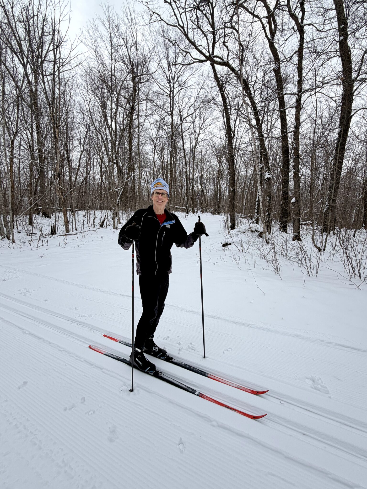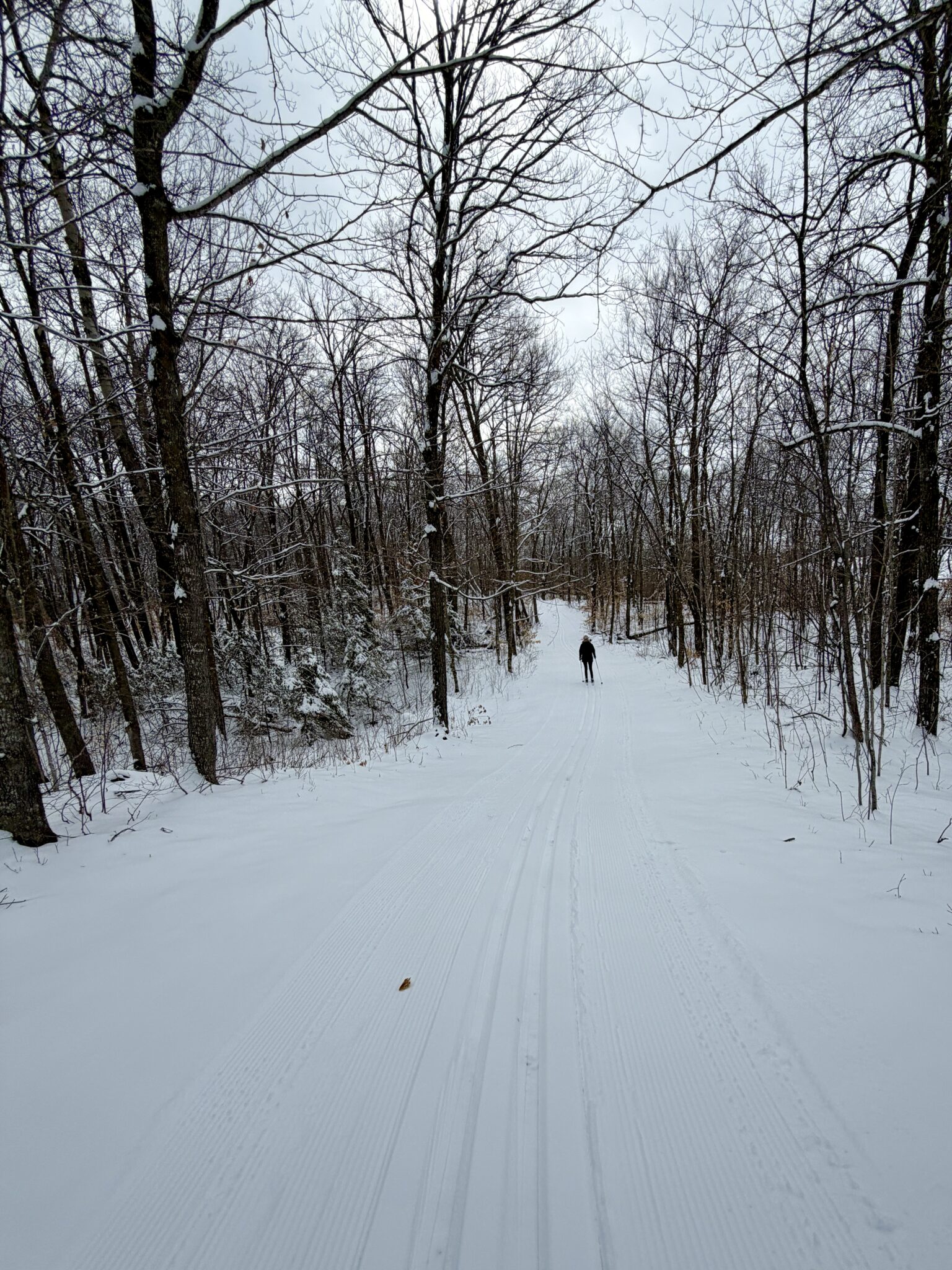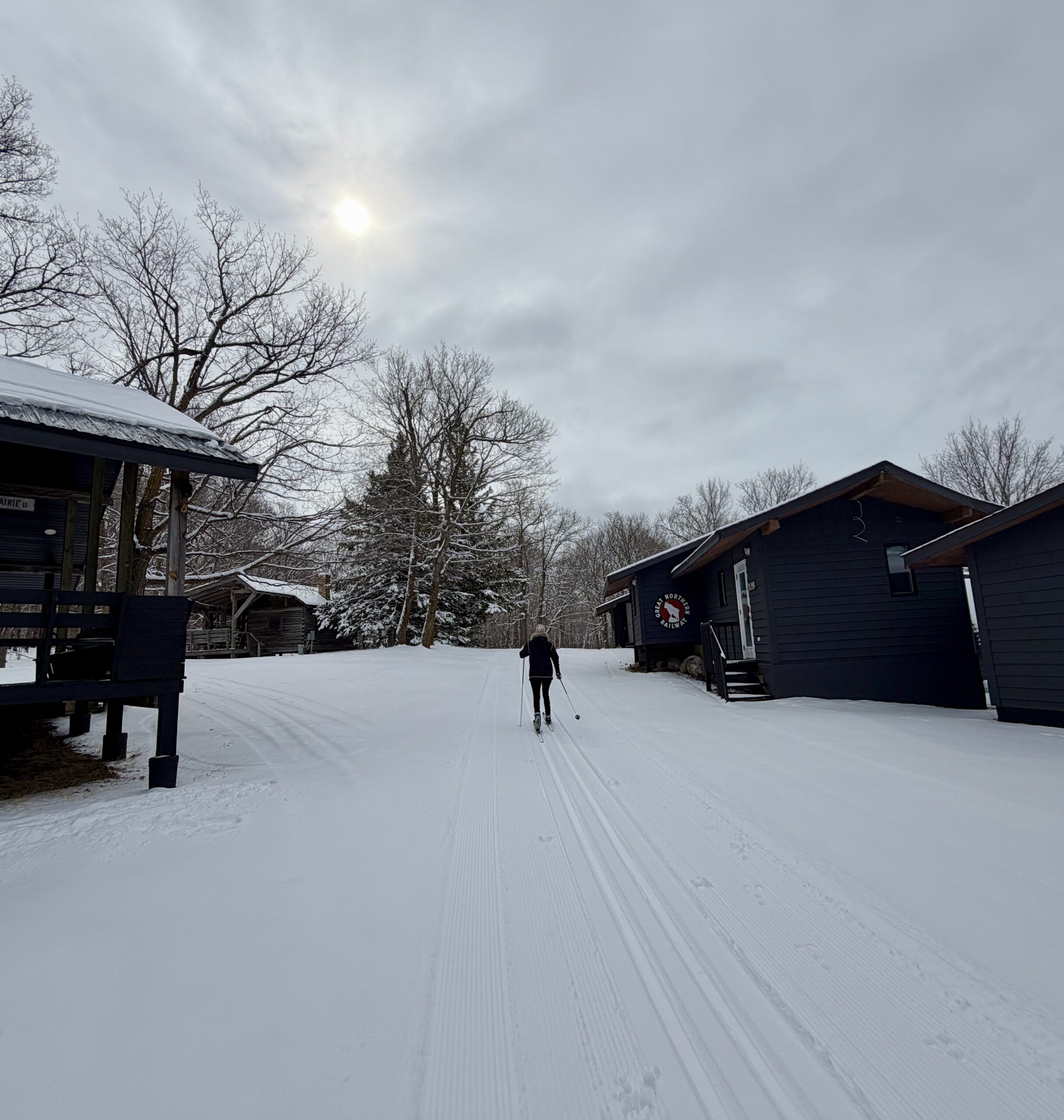 Striding through the lodging at Maplelag, April 3rd,2026. Select trails are now open for the weekend thanks to late season snow and grooming. Trail Report here: