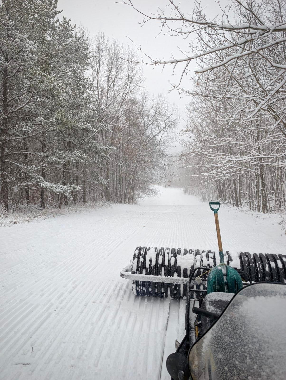 Snow!!As of 8pm around 5-6″ of snow. We packed 18km of trail today, focusing on the inner trails and will be back out packing and combing the same trails Wednesday. Select trails will be open Thanksgiving and through the weekend for season pass holders.