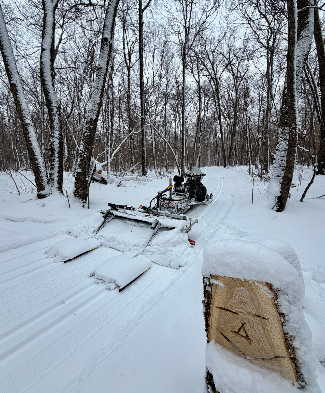 Trails are open but will be tough riding with the 3-4″ of new snow the past 24 hours and many areas drifted over on the trail. It might not be until Monday or Tuesday until we can groom.