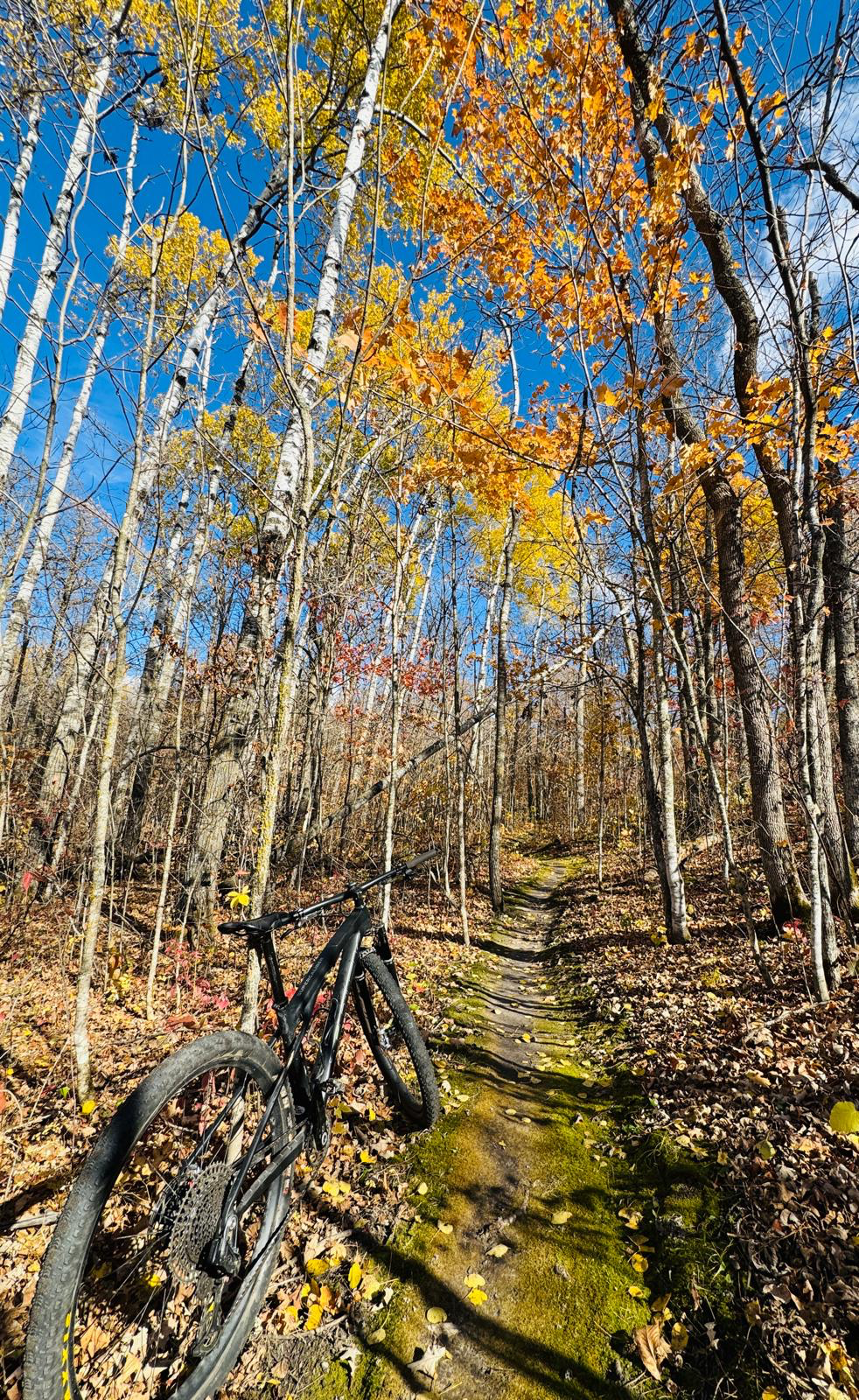 Hudson’s Hula on Twin Lakes singletrack with scattered leaf covering, October 14th, 2025.