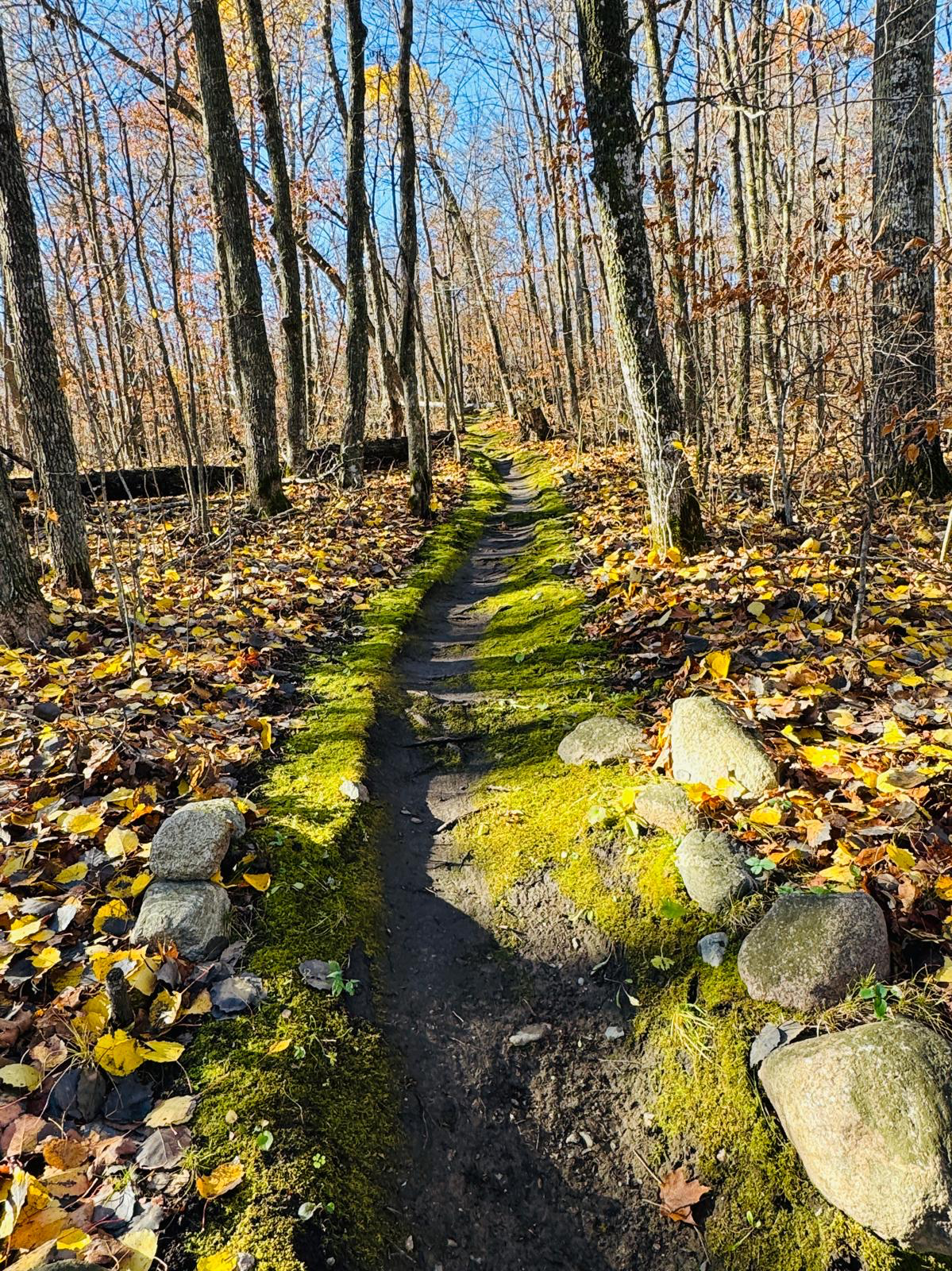 The entire 25 mile LagChilada course has been blown out the past 10 days. A few leaves blowing in after blowing last week but overall all nice Fall riding as most of the leaves have dropped from the trees. With fresh blown trail, great sight lines etc. we are in the “sweet spot” of Fall riding.