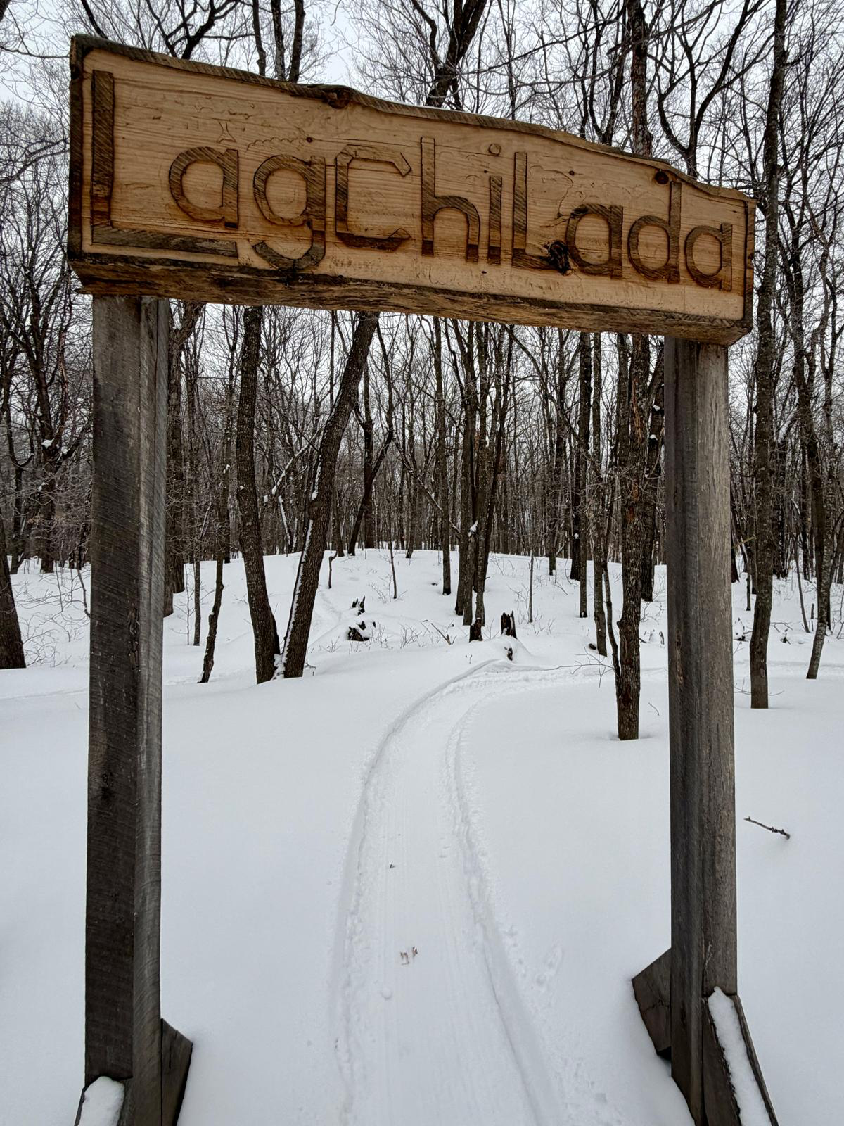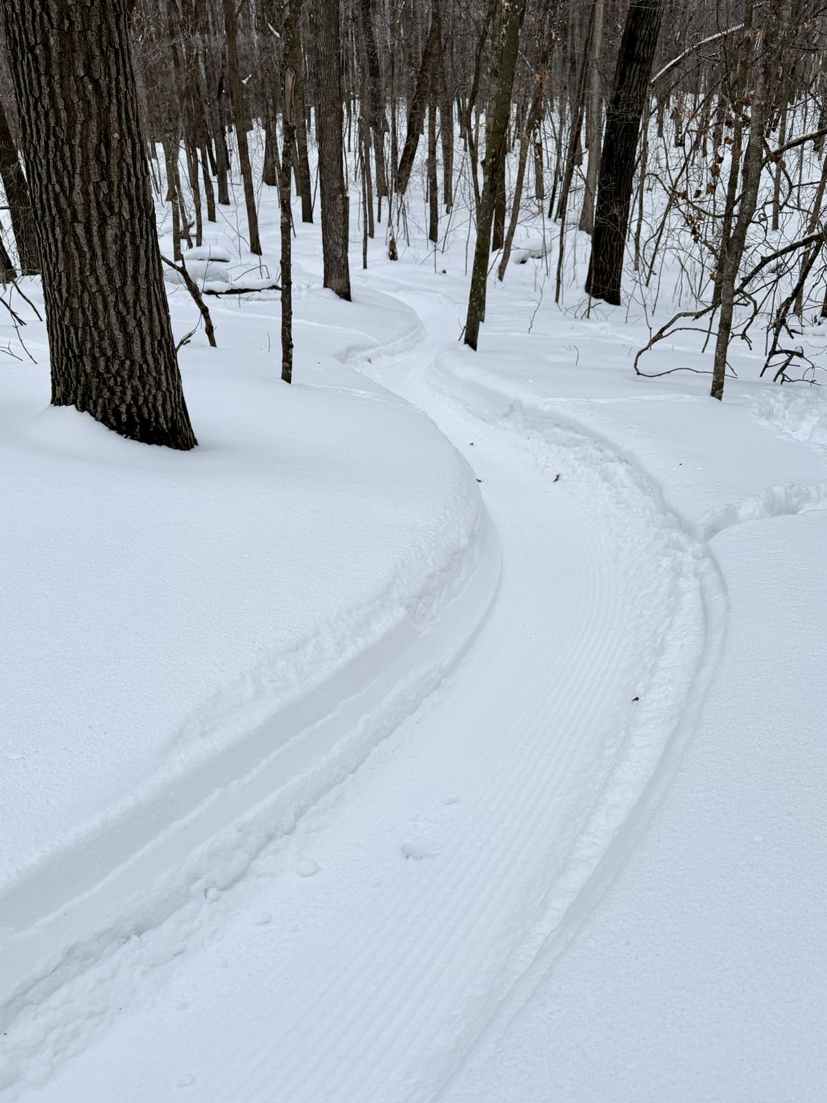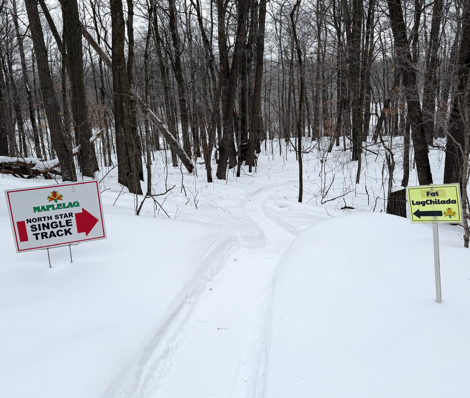 Groomed segments include Feeling Lucky, Winter Bjorps, SukkerWest, North Star extension, and the Twin Lakes Bridge loop, returning on Loon Return. These segments can be accessed from the driveway or you can make a loop starting on Skaters Waltz ski trail to the right and follow that until the Bjorps singletrack.