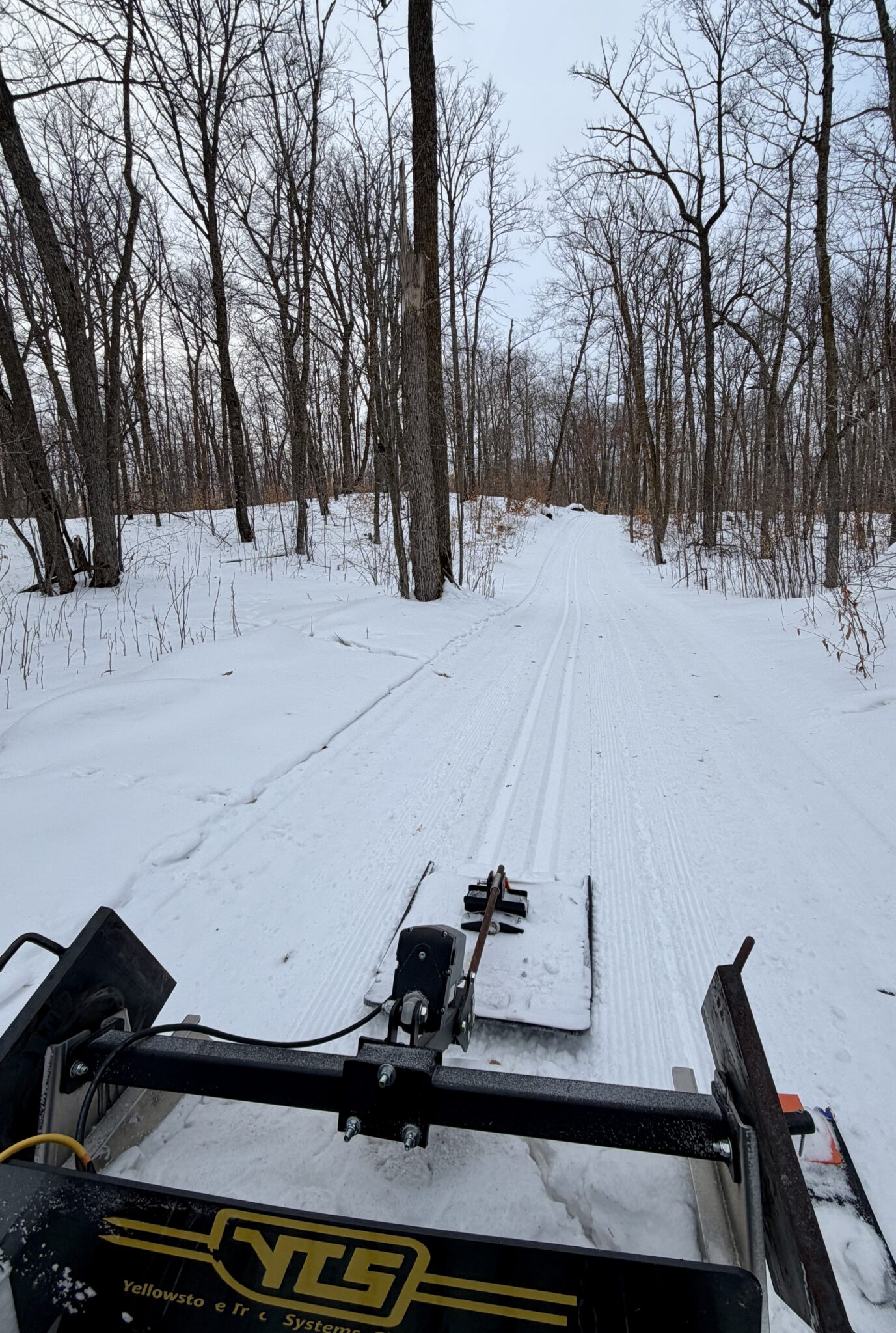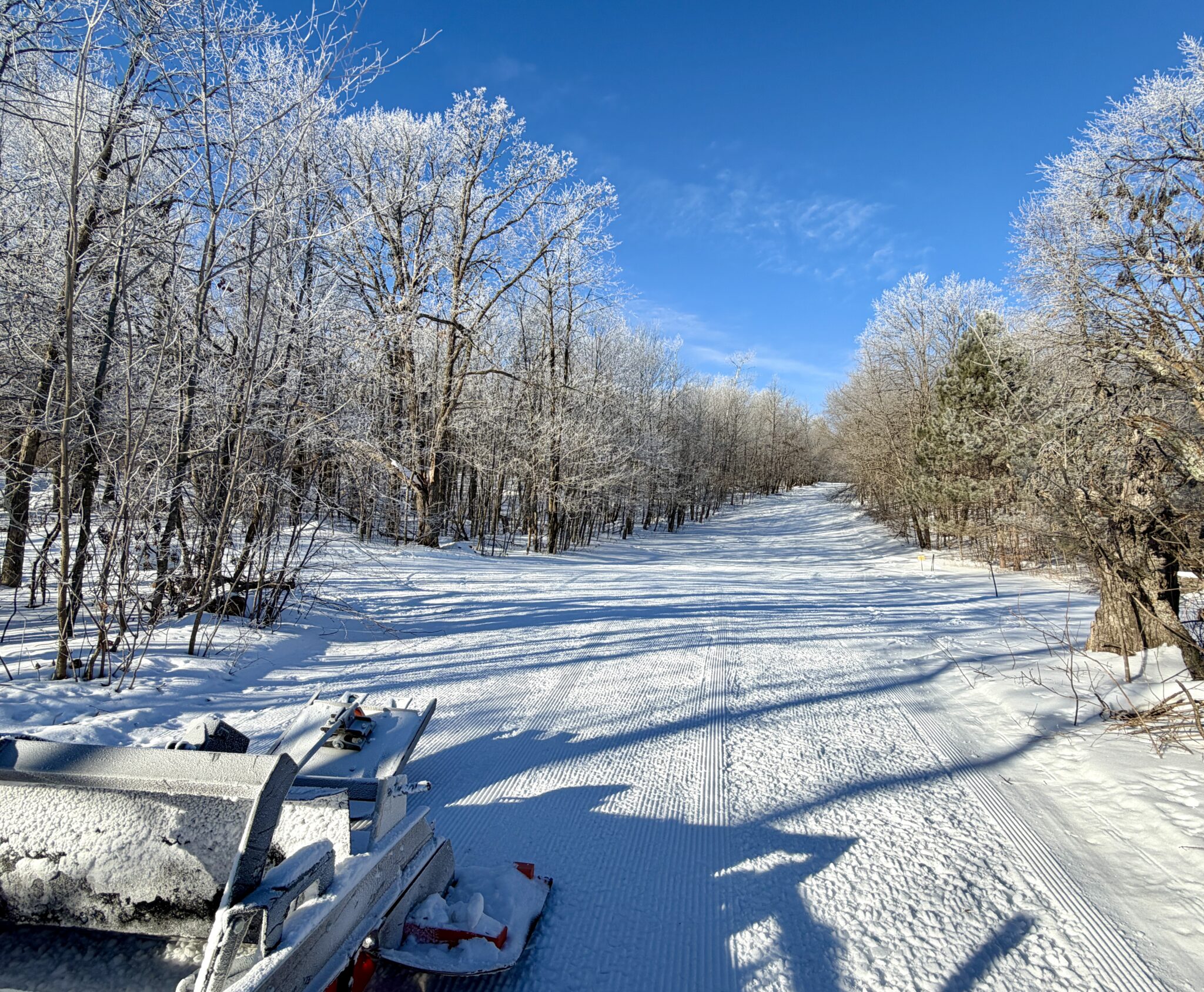 Trails are open. Hard freeze overnight setting up yesterday’s soft snow from a day with high humidity and above freezing temperatures. Grooming this morning digging deep in the base and pulling up drier snow and softening the trails. Good to very good reports from skiers today where it has been groomed. Trails groomed today include Rootin Tootin, Roy’s Run, Sukkerbusk, Sap Run, Mother Hen, Wavy Gravy, JibFly and Twin Lakes. New track on lake loop also groomed. Skaters Waltz also groomed. Where no grooming, expect glazed and faster tracks but folks are still skiing those trails like Island Lake and Bullhead lake trails. Just Ski.