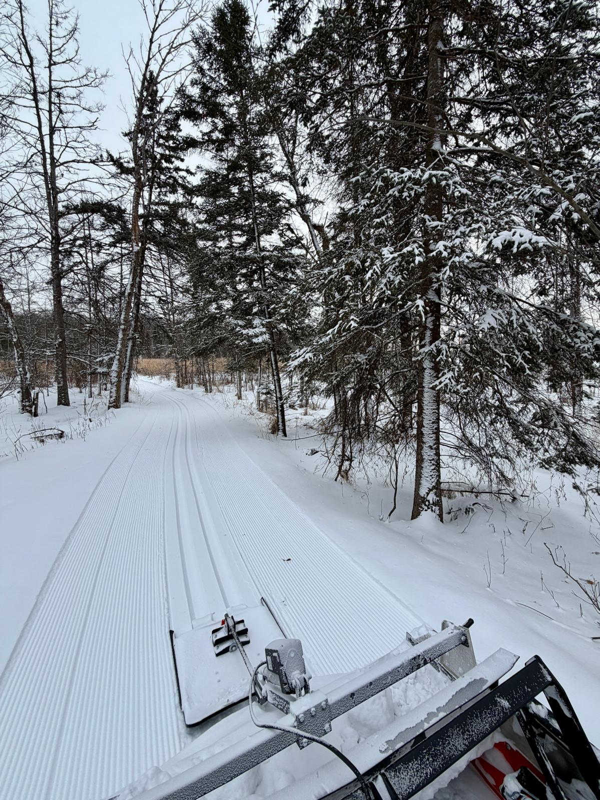 Trails are open. A couple inches of very light fluffy snow overnight. Should be fun to ski through today! We wrapped up an entire groom of the trail system yesterday setting track on the remaining singletrack trails, Bullhead Bootleg, Wavy Gravy and Island Lake. All the trails are in excellent condition with great coverage and a deep base of snow. This morning we are combing out all the skate trails.
