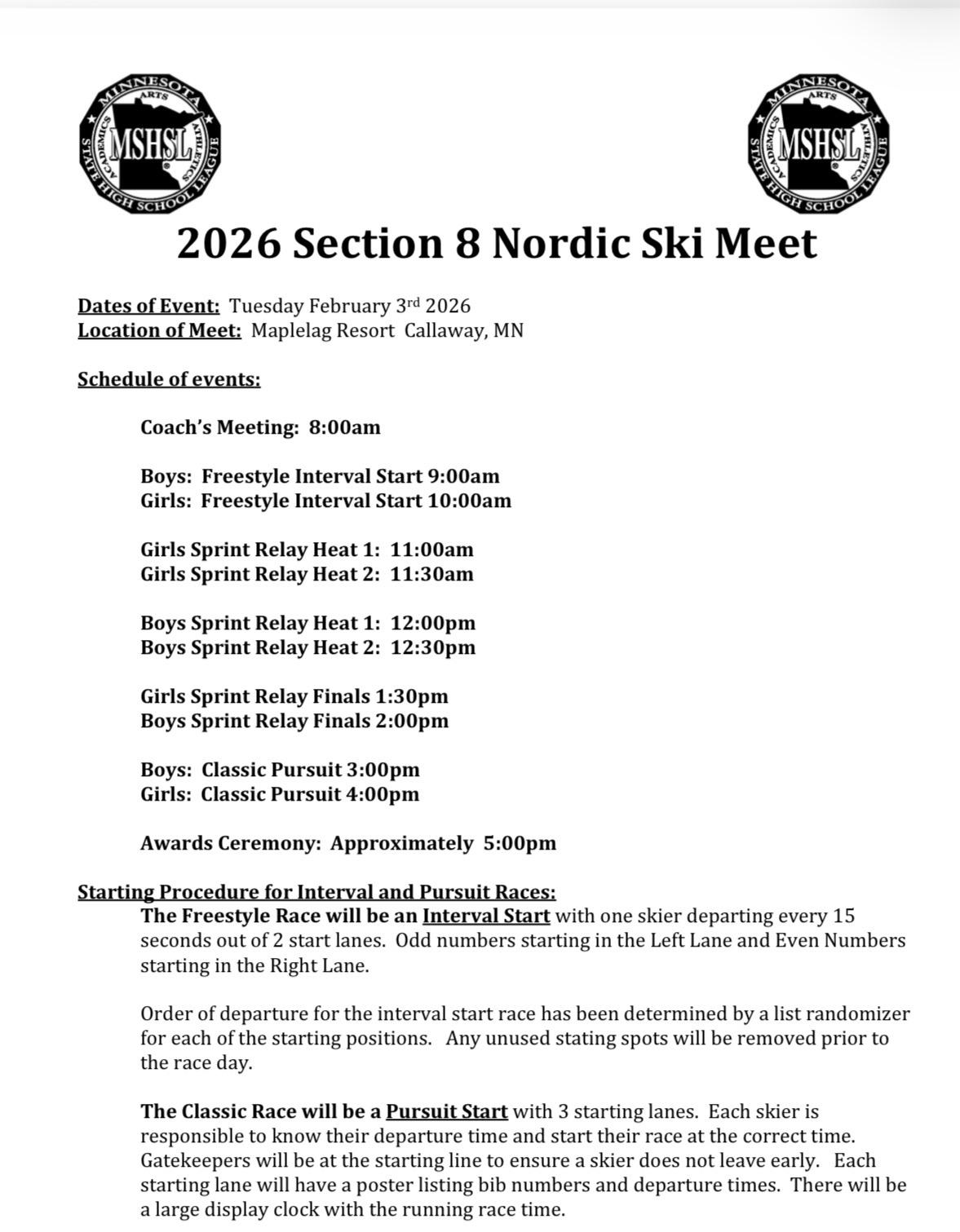Section 8 Nordic Ski Championships will be held on Tuesday February 3rd on portions of Sap Run, Sukkerbusk, all of JibFly and most of Mother North Star. All other 50km of trail will be open for day skiing. Recommended to use Loon Return to access Sukkerbusk to the western trail and northern trails. Schedule below.