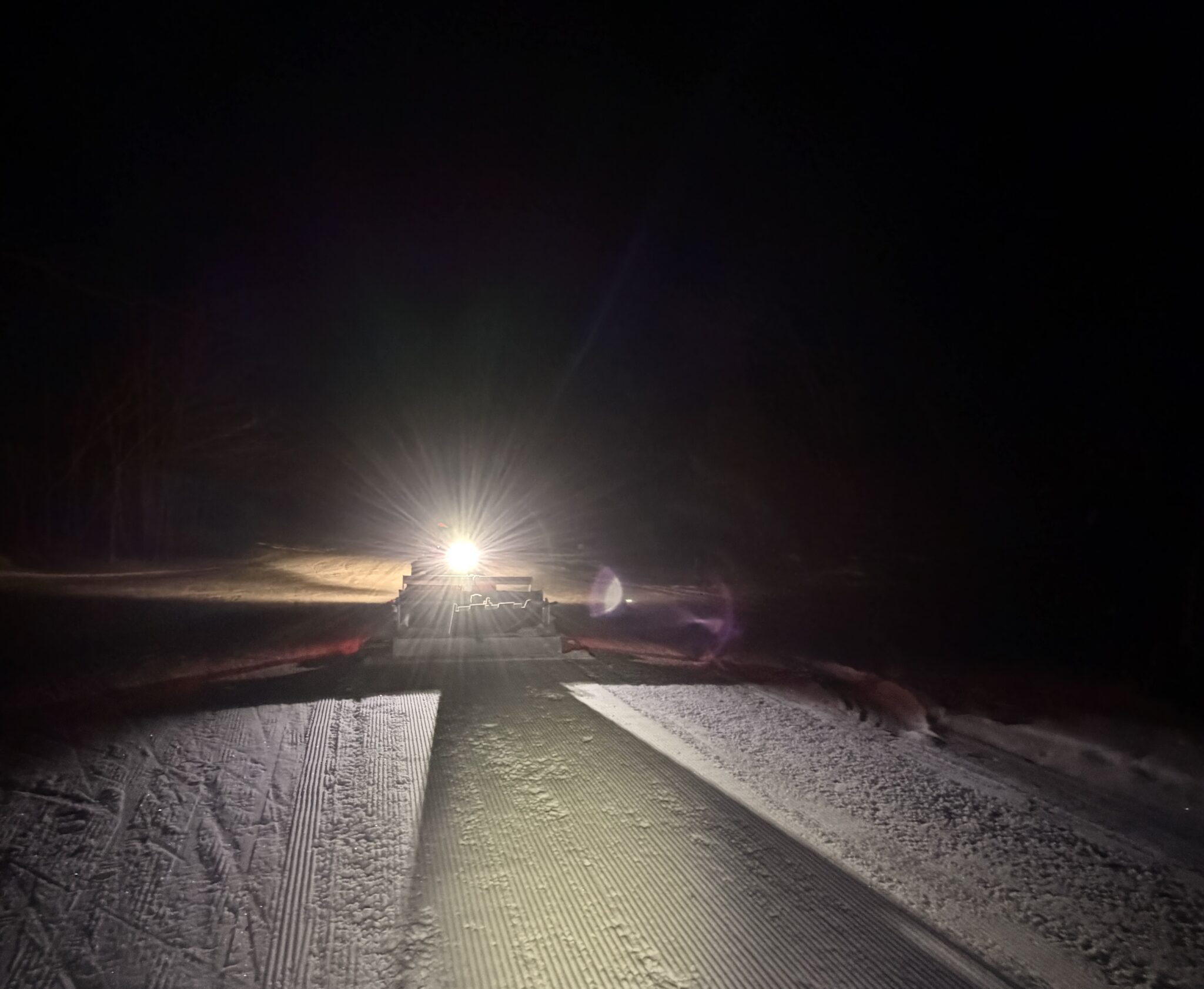During “spring conditions” we groom later in the day which sets up the trails a bit harder after a hard freeze, but that is with intention and purpose. Harder tracks will last and take longer to soften when it warms up and sun is beating down. During “spring” conditions, we welcome the warmer temps in the afternoon to soften up the trails for skiing and grooming later in the day and evening.