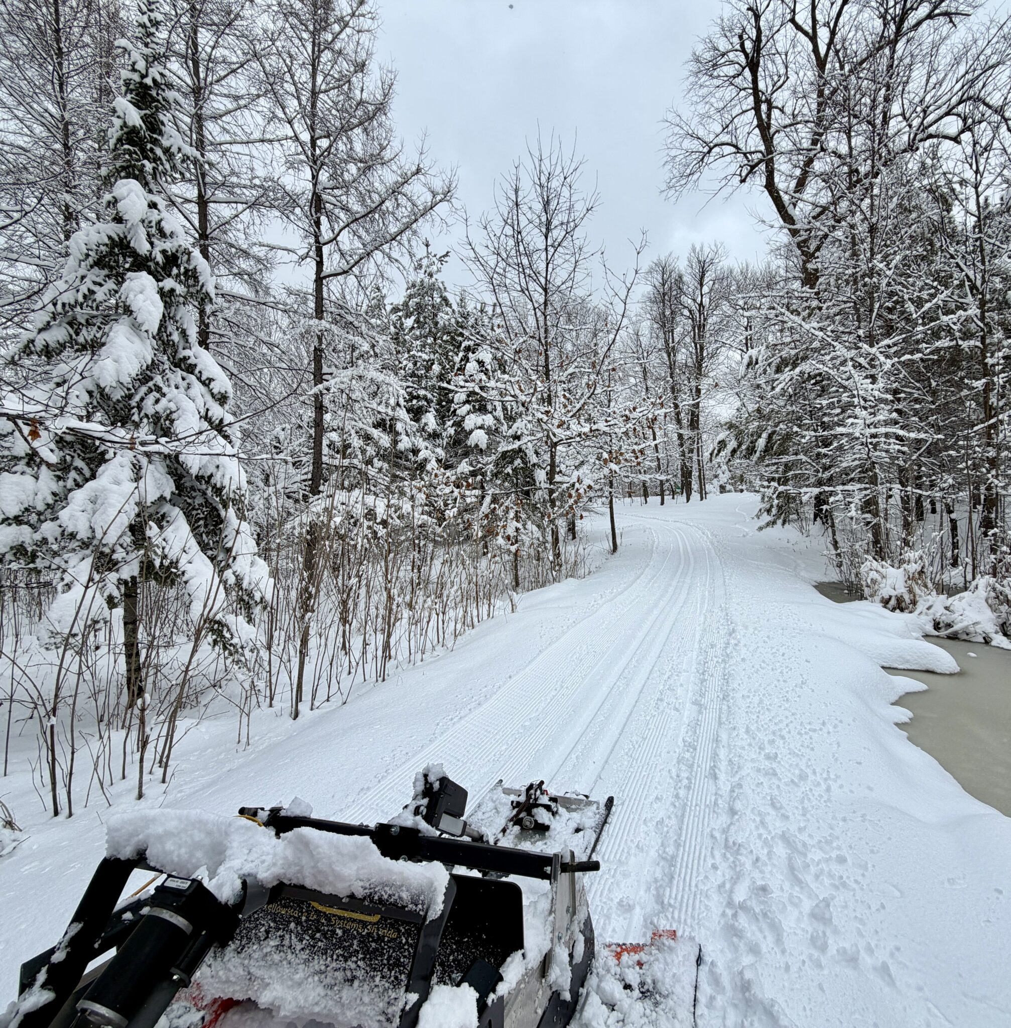Winter Returns! 8-9″ of heavy dense snow as of 8am Saturday morning. 3-4″ of snow Thursday evening. We groomed around 8km of trail and will work on the same trail today mostly packing. It will be difficult to get into the Maplelag driveway and travel on the country road until later today. Best bet to come ski would be Sunday early morning and most of Monday and again Tuesday morning. We will plan to have the trails open until Wednesday but if it looks to be skiable beyond that we will remain open!