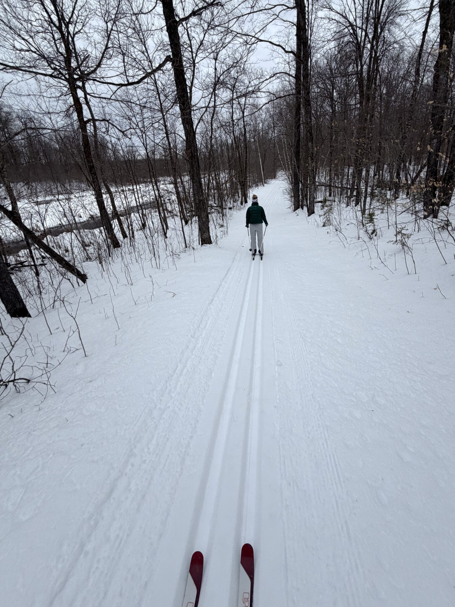 Trails are open. Froze down just enough last night to keep the deck firm. Should soften as the day passes. Will be skiable, expect variable conditions. Didn’t get above 32 yesterday and with cloud cover the snow stayed intact. Trails open and groomed with track set include Sap Run, Sukkerbusk, Twin Lakes, JibFly and Mother North Star. Top picks are Sukkerbusk, Sap Run. Twin Lakes is skiing well, use caution on the first downhill and extra caution on all downhills. A 3km loop is groomed for skating starting out of the soccer field and using much of Skaters Waltz and can be skied either direction. No tracks set on this loop but open for no track classic skiing.